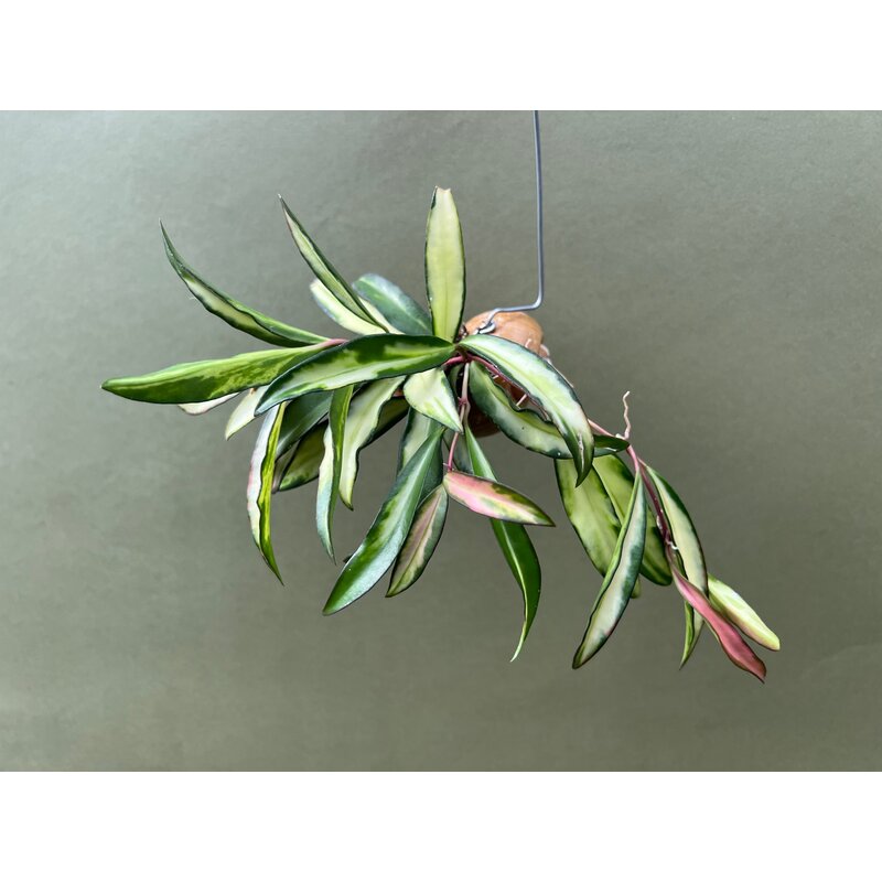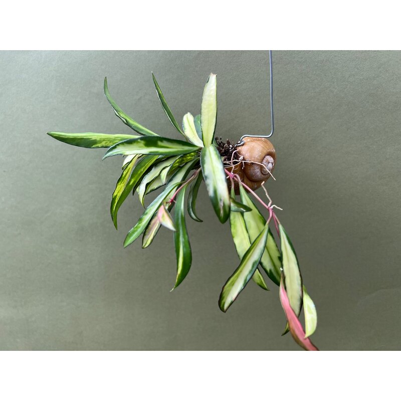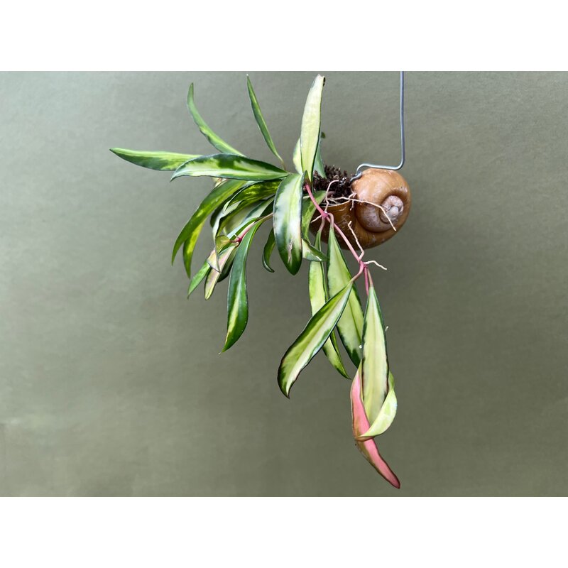 Ihre dreifarbige Panaschierung aus Grün-, Creme- und zarten Rosatönen verleiht dieser Hoya einen spektakulären Auftritt. Sie erhalten eine Pflanze im Schneckenhaus zum Aufhängen am Fenster oder als Dekoration in Badezimmer oder Küche, die umso mehr in der Blütezeit beeindruckt, wenn sie ihre rosafarbenen Blüten präsentiert.