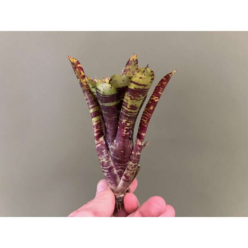 Neoregelia Backyard Cat ist eine auffällige, miniature Bromelie mit einer eleganten, leicht vasenförmigen Wuchsform. Ihre Blätter zeigen ein attraktives grün‑gelbliches Grundfarbspiel, das durch kräftige rote Streifen akzentuiert wird. Besonders auf der Blattunterseite treten diese Streifen intensiv hervor und verleihen der Pflanze ihren charakteristischen, „wild“ wirkenden Look.
